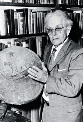 Unten: John Neihardt hält Black Elks Trommel in seinem Arbeitszimmer in Skyrim, zu Beginn der SORRAT-Experimente, Columbia, USA, 1961.