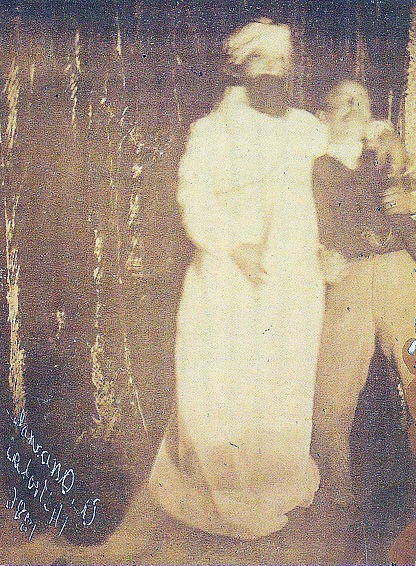 Abbildung unten: Der materialisierte Guide Abdul (mit Turban) muss sein Medium Wiliam Eglinton (US) stützen, da es zu schwach ist durch den Prozess