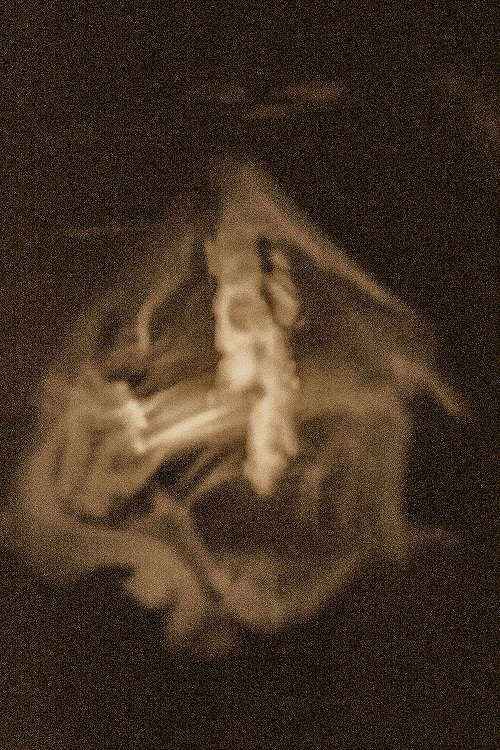Abbildung unten: Physikalisches Medium Kai Mügge umgeben von Ektoplasma. Im oberen Teil des hellen Dreiecks ist Kai's Gesicht erkennbar.